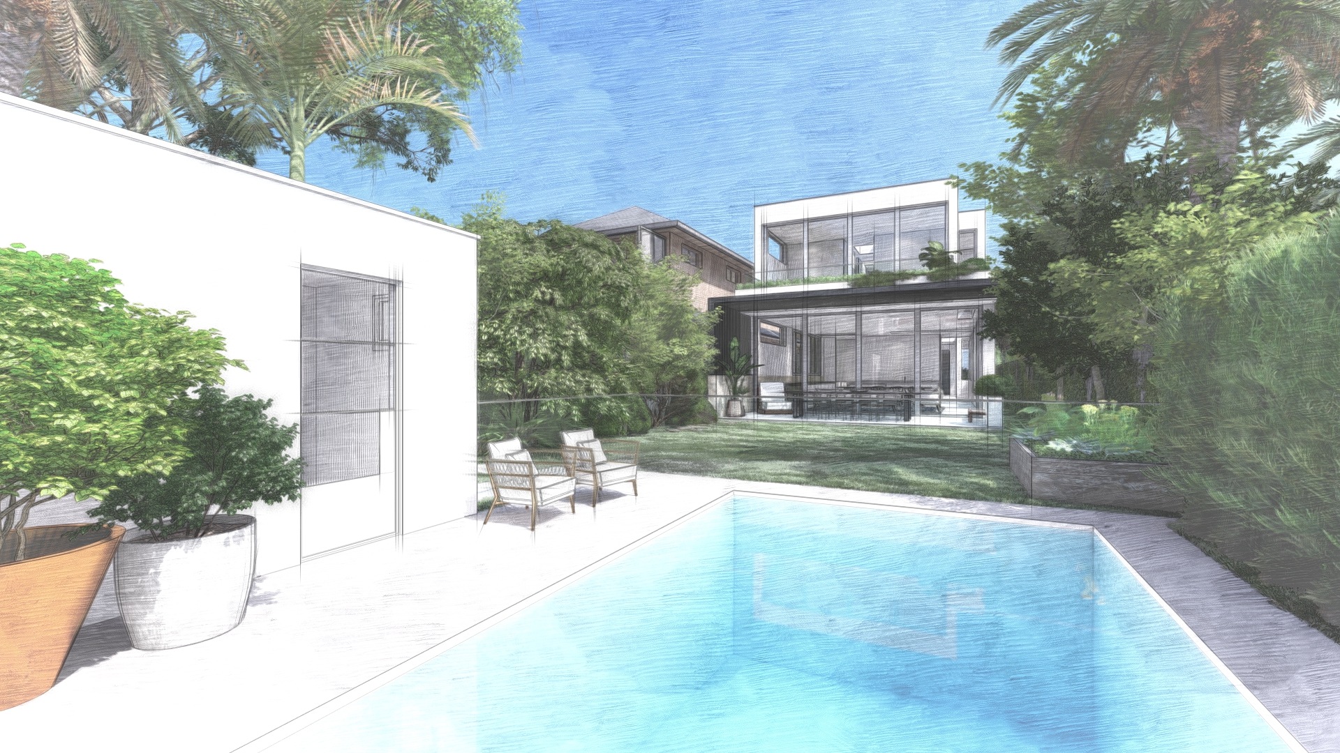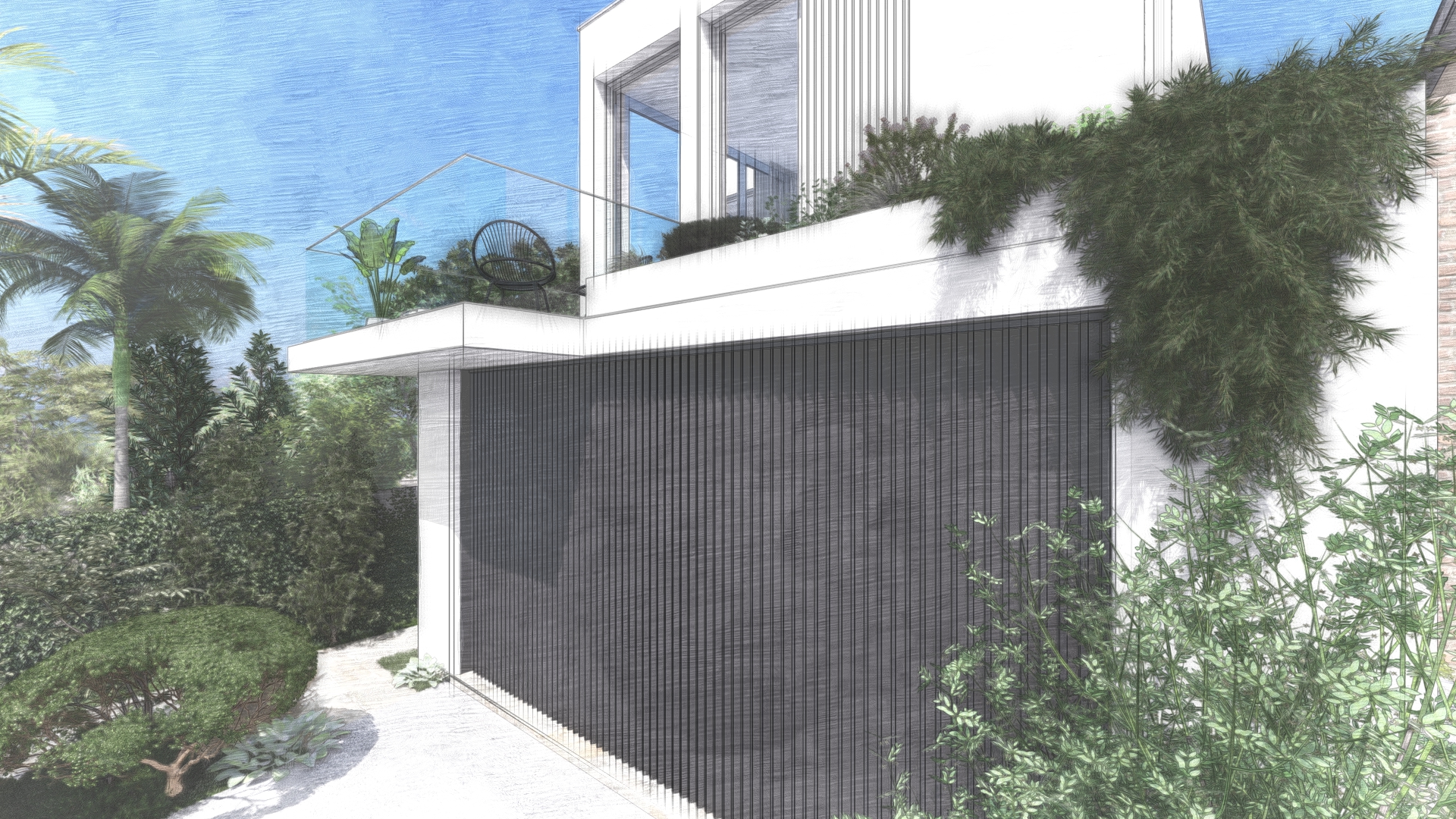 New build for a multigenerational family. Hemmed by both coast and bushland, the house incorporates a tiered design that follows the site's dramatic topography. Construction to commence in 2020.